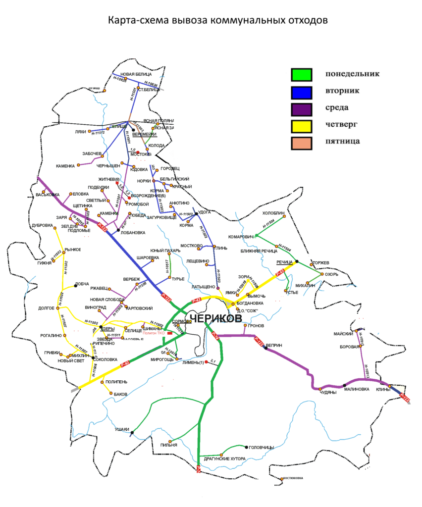 На балансе предприятия находится 1 полигон ТКО. Организована вывозка ТКО от частных домовладений, установлены индивидуальные контейнера в частном жилом фонде г.Чериков, агрогородоки Речица, Веремейки, населенные пункты Гронов, Вымочь, Богдлановка, Ямки,Зори. Вывоз ТКО осуществляется согласно утвержденной схемы вывоза.